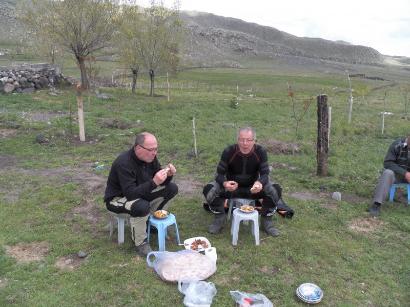 Tagwache war 08.00 Uhr - wir wollten unbedingt den Ararat - 5137m hoch -bei Schönwetter erleben - also sind wir im Hotel ISFAHAN geblieben, da es regnete. Nachmittags besuchten wir den Ihsak Pasha Palast - das Kloster war leider geschlossen, von Aussen jedoch zu besichtigen. Ein wunderschönes Bauwerk auf einem Hügel oberhalb der Stadt Dogubayazit. Dann gings weiter über Schotter und Steine auf knapp 2600m zu den Bergdörfern der Kurden. Die Fahrt mit den Bikes war traumhaft. Ca. 15km Enduro pur. Natürlich wie überall in diesem Gebiet, Schaf, Ziegen und Kuhherden. Die Felder, bzw. Wiesen sind immer wieder mit Steinmandalas - ich nenne es halt so - eingerahmt. Schaut sehr schön aus. Beim letzten Bergdorf - auch Ausgangspunkt für die Bergsteiger sind wir herzlichst empfangen worden - natürlich gleich einmal mit Cay. Das Dorf hat 18 Einwohner und eine eigene Schule, mit derzeit 4-5 Kindern. Die Häuser sind flach und aus Steinen errichtet. Der Schaf/Kuhmist wird ausserhalb der Häuser in Form einer Steinmauer aufgeschlichtet und getrocknet, als Heizmaterial für den Winter. Das Leben in diesen Dörfern ist sehr anstrengend. Gegen 12.00 Uhr wurden wir zum Essen eingeladen. Der Griller wurde angewofen - es gab schmackhaftes Hühnerkebab. Der Salat ein Traum. Zwischendurch sind noch Nachbarn dazu gekommen, die gleich mitgegesssen haben. Das am Füße das Ararat, bzw. Agri Dag auf kurdisch. Einfach wunderbar. Dann gings weiter ca. 30km zu iranischen Grenze. Vor der Grenze ca. 10km lange Lastwagen-kolonnen - in Zweierreihen natürlich sind wir direkt zum Border vorgeafhren, und haben gleich von den Zöllnern Cay erhalten. Nach einem kurzen Smalltak gings über Feldwege zur türkisch/iranischen Aussengrenze. Von den schwer bewaffneten Beamten wurden unsere Pässe einbehalten. Offensichtlich befürchteten sie, dass wir im Iran bleiben - nein Scherz - aus welchen Gründen auch immer, die Pässe mussten wir abliefern. Wir fuhren weiter zu der Stelle Namens CUKURU, wo im Jahr 1892 ein Meteorit mit einem Durchmesser von 35m auf der Erde einschlug. Das Loch ist 60m tief. Davon sind 30m noch zu erkennen, im Rest steckt der Meteorit. Morgen gehst weiter nach Ani der ehemaligen historischen Hauptstadt von Armenien. Apropo wir haben beim Isak Pasha Saray eine Familie aus Niederösterreich die mit dem Wohnwagen noch bis Juli in der Türkei unterwegs ist getroffen.Grüße an die Familie und gute Weiterfahrt, wir werden euch beim Heurigen mal besuchen. Jetzt spinnt das Inet weitere Bilder folgen Morgen - sofern es das Netz zulässt.